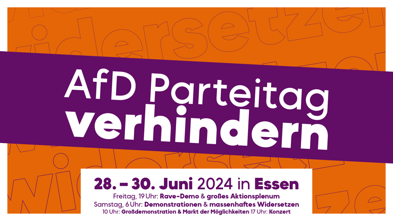 Vom 28. bis 30. Juni 2024 will die AfD in der Grugahalle Essen – im Herzen des Ruhrgebiets – ihren Bundesparteitag abhalten. Wir lassen nicht zu, dass die AfD unwidersprochen ihren Rassismus und ihre antidemokratische, rechte Hetze verbreitet! Gemeinsam mit Gewerkschaften, VVN-BdA, Attac, Parteien, regionalen Initiativen, Omas gegen Rechts, FFF und vielen mehr rufen wir dazu auf, an allen drei Tagen zu protestieren.