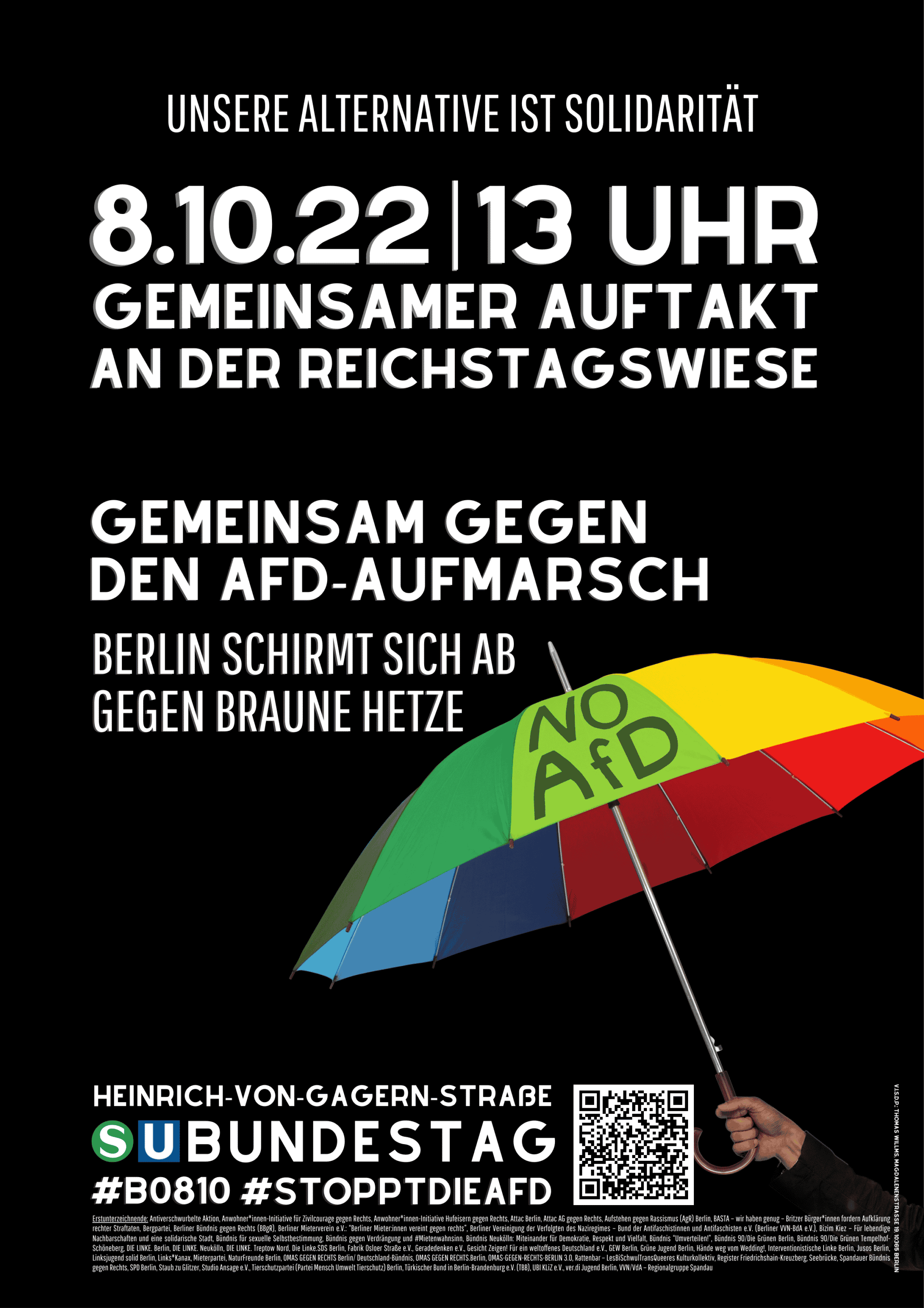 Für Samstag, den 8. Oktober mobilisiert die AfD bundesweit zu einem zentralen Aufmarsch nach Berlin. Unverhohlen lädt die AfD-Parteispitze offene Neonazis ein sich zu beteiligen.