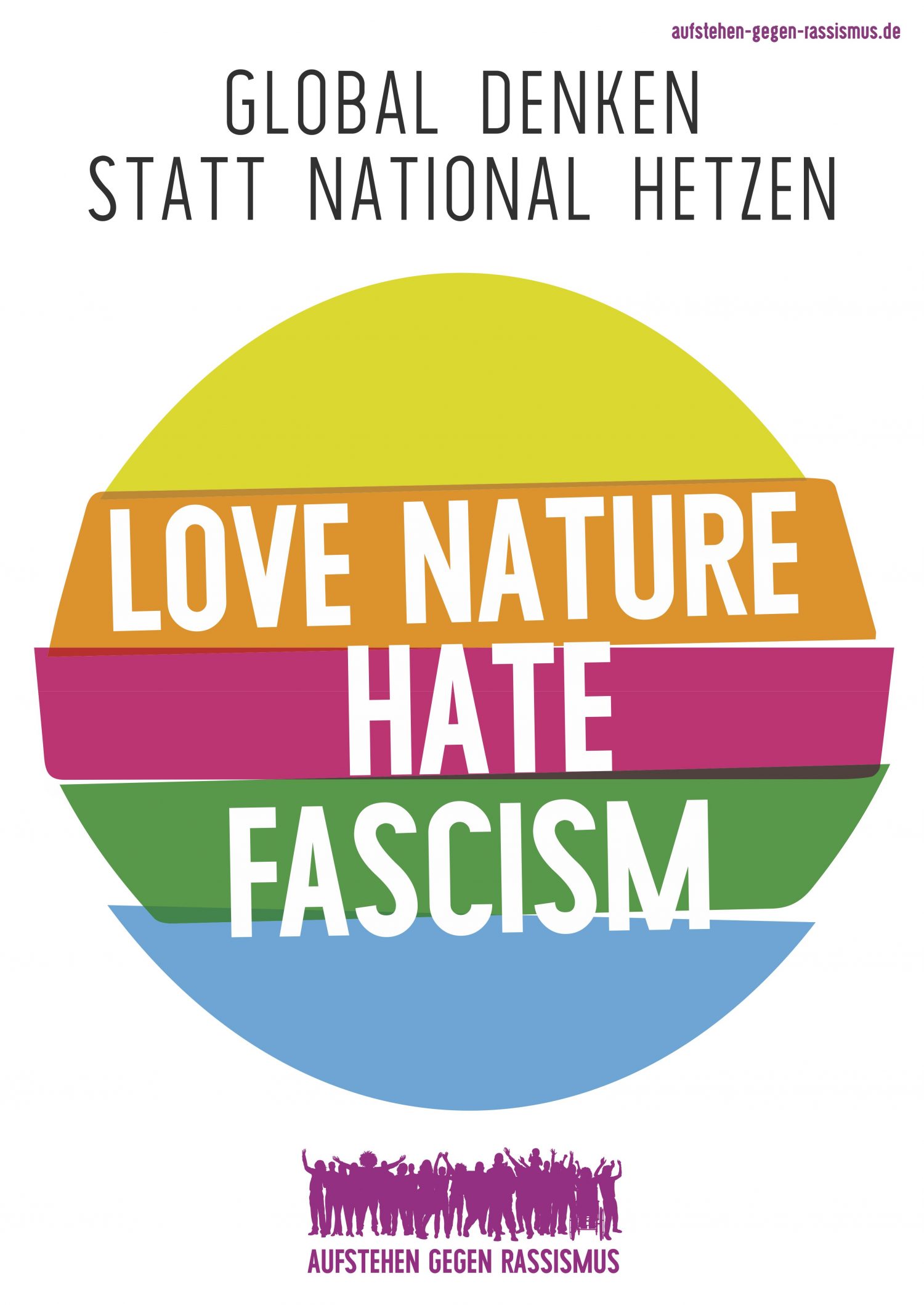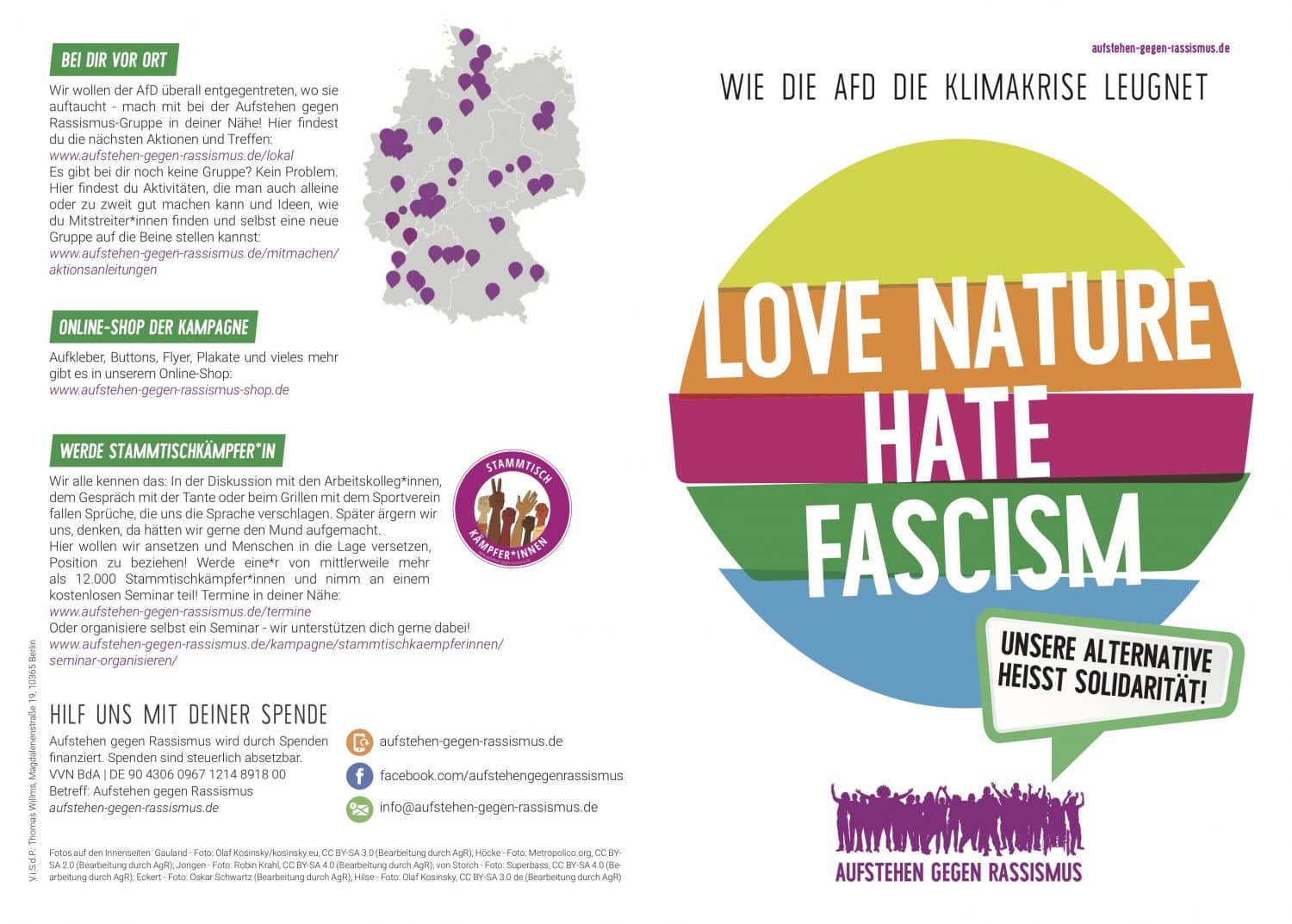 - Faltflyer (DIN A5) “Love Nature – Hate Fascism“ zur Klimawandelleugnung der AfD