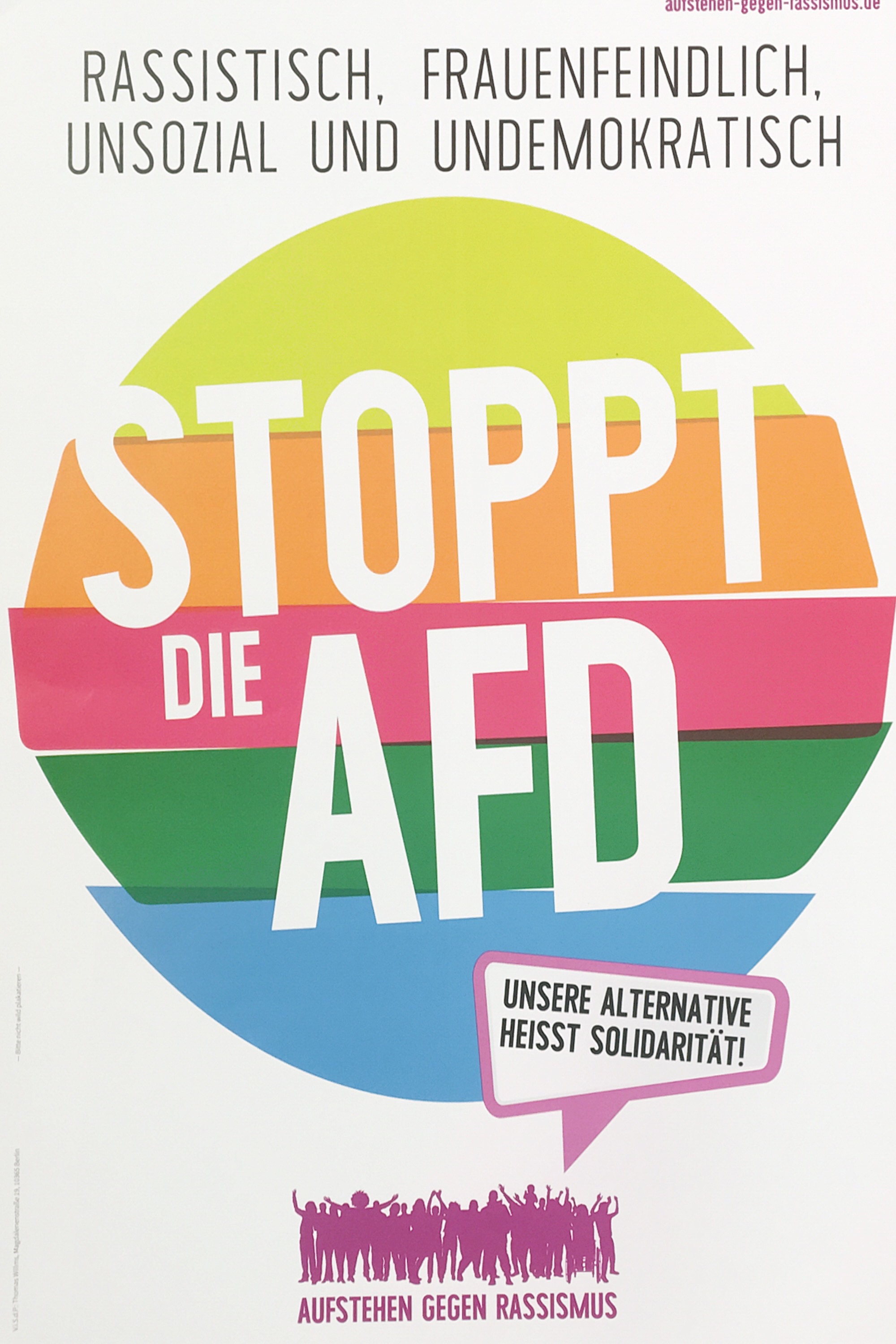 - “Stoppt die AfD” (im Webshop auch als Demoplakat auf Pappe)