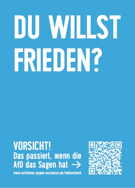 - Faltflyer (DIN A5) “Kein Frieden mit der AfD” zur Selbstinszenierung der AfD als vermeintliche “Friedenspartei”
