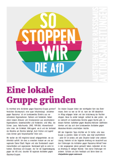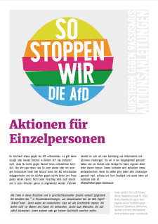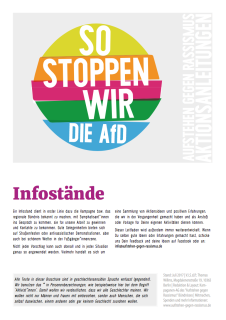 Wir wissen, wie viel Überwindung es kostet, den ersten Schritt zu machen und sich gegen die AfD zu engagieren. Als Hilfestellung, Inspiration und Motivation haben wir einige Erfahrungen zusammengetragen. Herausgekommen ist eine Sammlung von Aktionsideen und Argumenten, die gern auf eure Situation vor Ort angepasst werden kann. Gleichzeitig wollen wir damit einen Anstoß zum kollektiven Erfahrungsaustausch geben.