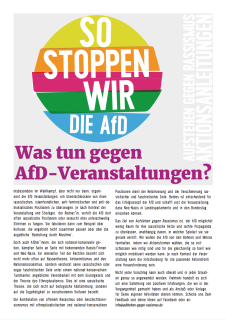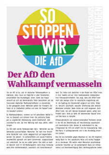 Die AfD ist eine im Kern faschistische, rassistische, frauenfeindliche und undemokratische Partei. Mit ihr sind Rassist*innen und Neonazis in die deutschen Parlamente eingezogen. Wir wollen nicht zulassen, dass mit ihr Vorurteile, rechte und rassistische Gewalt weiter ansteigen.