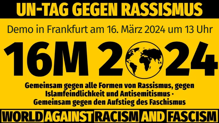 - Frankfurt/Main: Demonstration “Gemeinsam gegen alle Formen des Rassismus, gegen Antisemitismus und Islamfeindlichkeit! Gemeinsam gegen den Aufstieg des Faschismus” am Samstag, 16. März 2024 mit Auftaktkundgebung um 13 Uhr an der Ignatz-Bubis-Brücke (Frankfurter Seite) und Abschlusskundgebung um 14 Uhr am Römerberg. Veranstalter: Aufstehen gegen Rassismus RheinMain, DIE LINKE. Frankfurt, Grüne Frankfurt, Der Paritätische Hessen und viele andere. Aufruf und Infos auf Facebook ». Sharepic ».