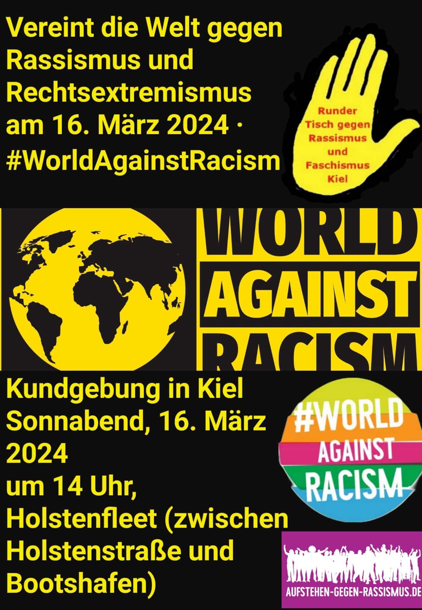 - Kiel: Kundgebung zum weltweiten Aktionstag gegen Rassismus und Faschismus am Samstag, 16. März 2024 um 14 Uhr, Holstenfleet. Veranstalter: Runder Tisch gegen Rassismus und Faschismus Kiel. Aufruf und weitere Infos auf Facebook », Sharepic ».
