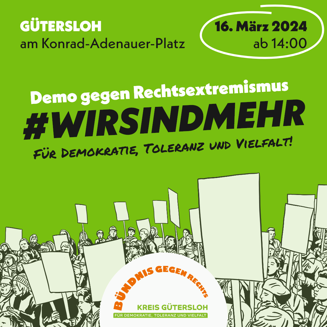 - Gütersloh: Demonstration “Gegen Rechtsextremismus #WirSindMehr Für Demokratie, Toleranz und Vielfalt!” am Samstag, 16. März ab 14 Uhr am Konrad-Adenauer-Platz. Veranstalter: Bündnis gegen Rechts im Kreis Gütersloh. Sharepic ».