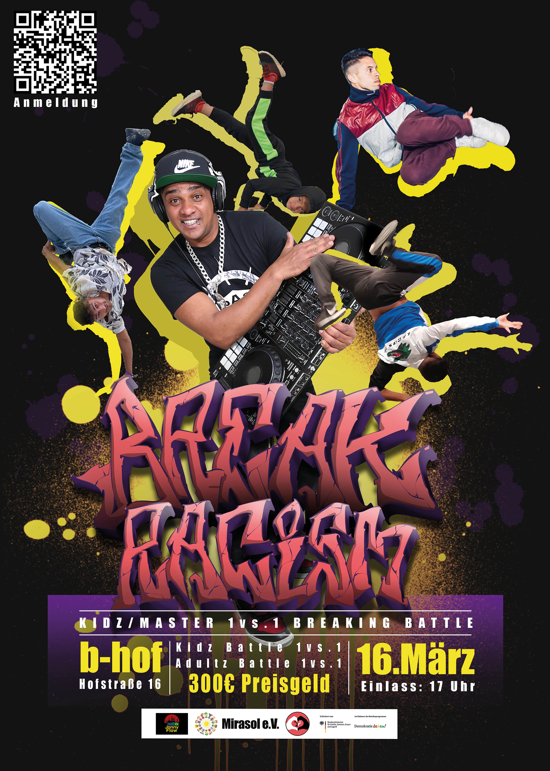 - Würzburg: Breakdance Battle “Break Racism” am Samstag, 16. März 2024 um 17 Uhr im b-hof, Hofstraße 16. Anmeldung/Info: https://and8dance/de/e/4656 (für Kinder ist die Teilnahme kostenlos, schreibt hierzu eine E-Mail an: mirasol[at]outlook.de). Veranstalter: Mirasol e.V. Flyer mit weiteren Infos »