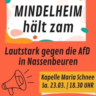 - Memmingen: Aktion “Mindelheim hält zam – lautstark gegen die AfD in Nassenbeuren” am Samstag, 23. März um 18.30 Uhr gegen ein Treffen des AfD Kreisverbands Memmingen an der Kapelle Maria Schnee. Veranstalter: Mindelheim gegen Rechtsextremismus. Sharepic ».