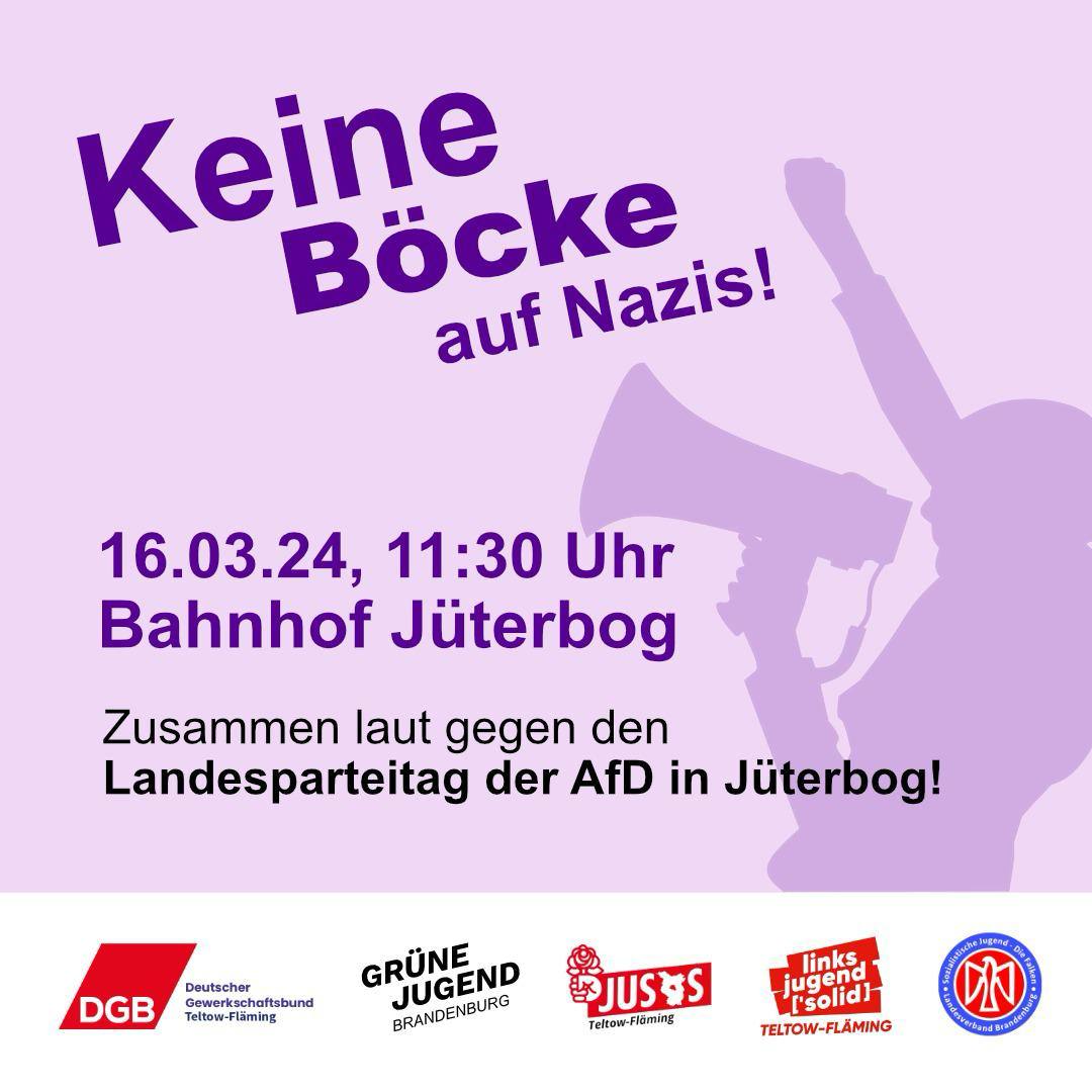 - Jüterbog: Demonstration “Hand-in-Hand gegen die AfD – Kein Bock auf Nazis in Jüterbog!” gegen den Landesparteitag der AfD Brandenburg am Samstag, 16. März. Beginn: Bahnhof Jüterbog um 11:30 Uhr. Ende: vor der Wiesenhalle. Veranstalter: ein breites Bündnis von Menschen und Organisationen aus der Stadt und ganz Berlin-Brandenburg. Sharepic ».