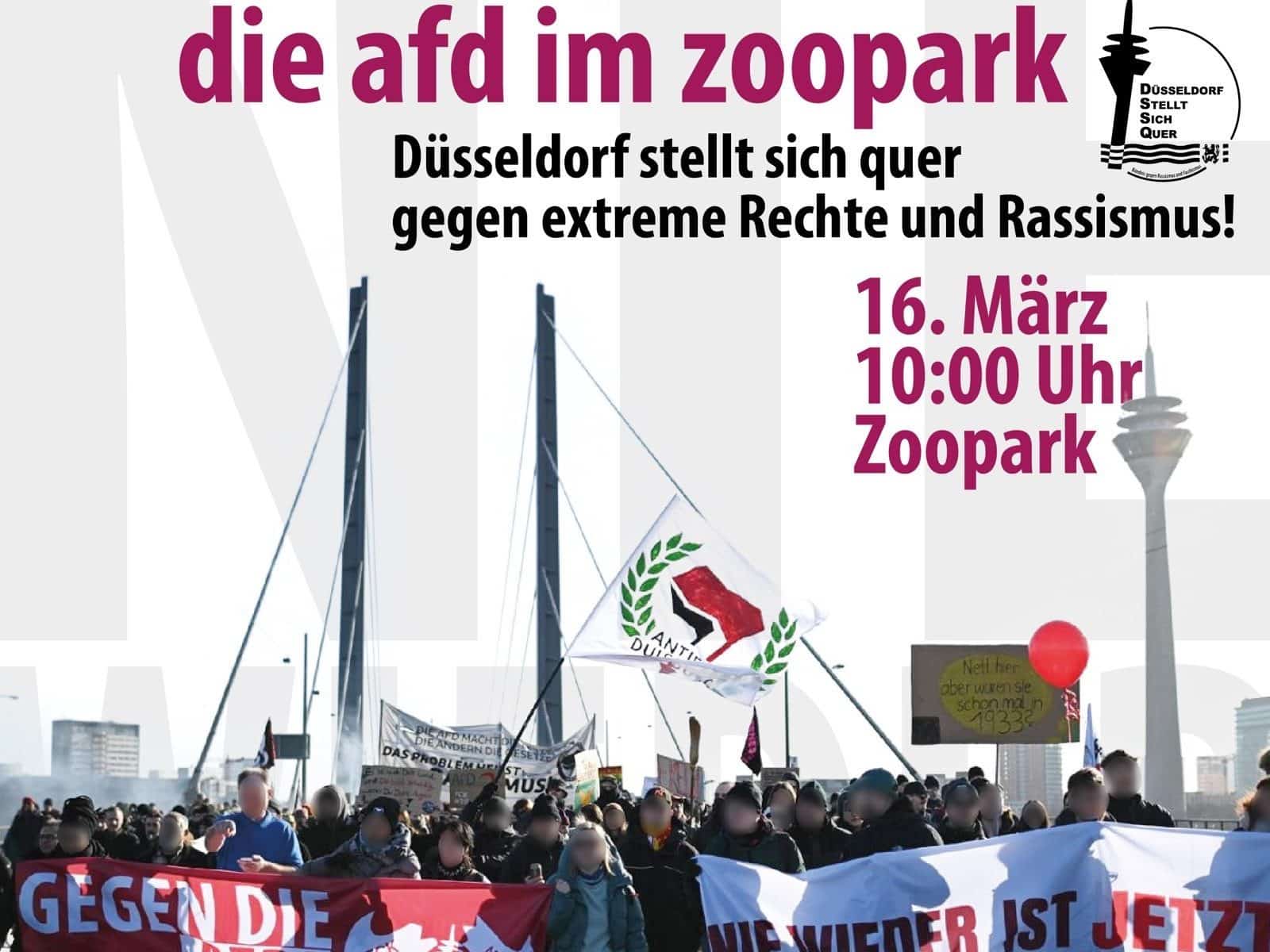 - Düsseldorf: Kundgebung “Zusammen gegen die AfD im Zoopark” am Samstag, 16. März 2024 ab 10 Uhr am Zoopark gegen eine AfD-Kundgebung, die dort um 11 Uhr angekündigt. Veranstalter: Düsseldorf stellt sich quer (DSSQ). Aufruf, Flyer und weitere Infos ». Sharepic ».